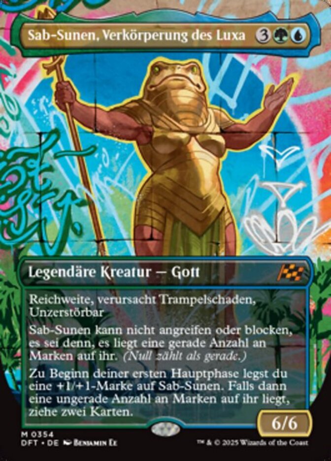 | Rules | Reach, trample, indestructible Sab-Sunen can't attack or block unless it has an even number of counters on it. (Zero is even.) At the beginning of your first main phase, put a +1/+1 counter on Sab-Sunen. Then if it has an odd number of counters on it, draw two cards. |