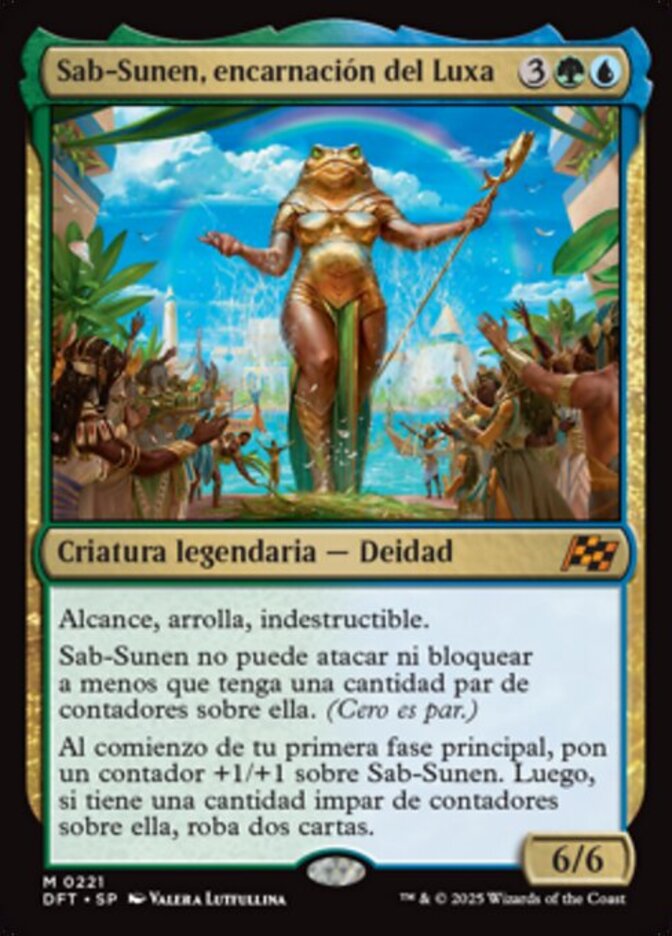| Rules | Reach, trample, indestructible Sab-Sunen can't attack or block unless it has an even number of counters on it. (Zero is even.) At the beginning of your first main phase, put a +1/+1 counter on Sab-Sunen. Then if it has an odd number of counters on it, draw two cards. |