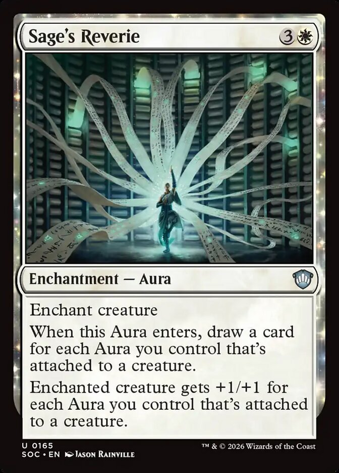 | Rules | Enchant creature When Sage's Reverie enters the battlefield, draw a card for each Aura you control that's attached to a creature. Enchanted creature gets +1/+1 for each Aura you control that's attached to a creature. |