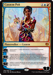 | Rules | +1: Scry 1. Saheeli Rai deals 1 damage to each opponent. −2: Create a token that's a copy of target artifact or creature you control, except it's an artifact in addition to its other types. That token gains haste. Exile it at the beginning of the next end step. −7: Search your library for up to three artifact cards with different names, put them onto the battlefield, then shuffle. |