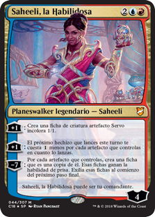 | Rules | +1: Create a 1/1 colorless Servo artifact creature token. +1: The next spell you cast this turn costs less to cast for each artifact you control as you cast it. −7: For each artifact you control, create a token that's a copy of it. Those tokens gain haste. Exile those tokens at the beginning of the next end step. Saheeli, the Gifted can be your commander. |