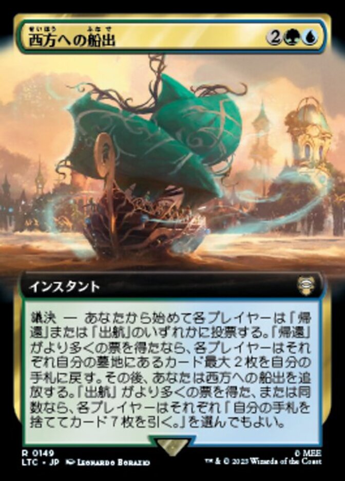 | Rules | Will of the council — Starting with you, each player votes for return or embark. If return gets more votes, each player returns up to two cards from their graveyard to their hand, then you exile Sail into the West. If embark gets more votes or the vote is tied, each player may discard their hand and draw seven cards. |