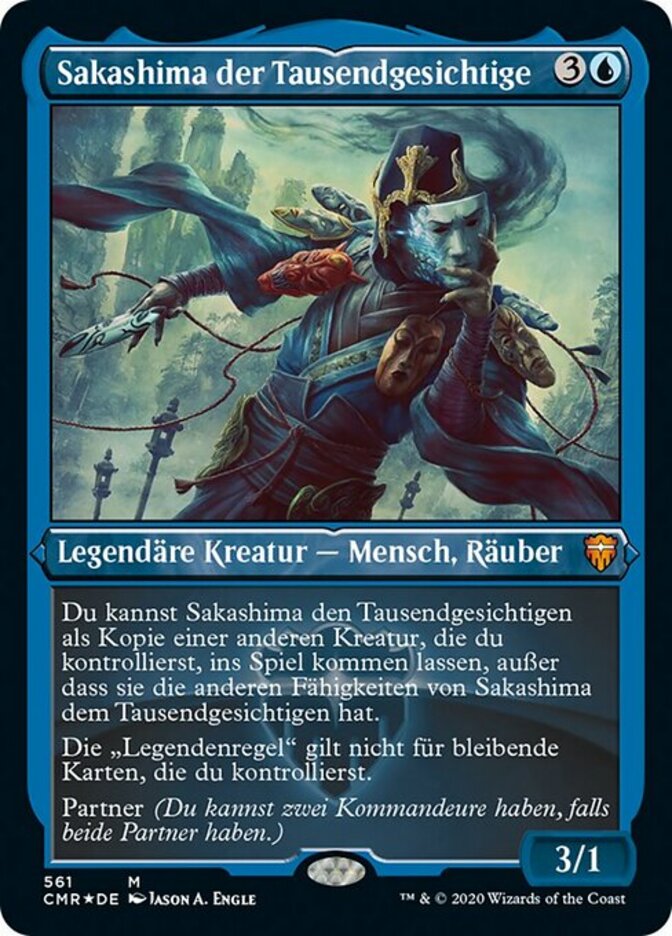| Rules | You may have Sakashima of a Thousand Faces enter the battlefield as a copy of another creature you control, except it has Sakashima of a Thousand Faces's other abilities. The "legend rule" doesn't apply to permanents you control. Partner (You can have two commanders if both have partner.) |