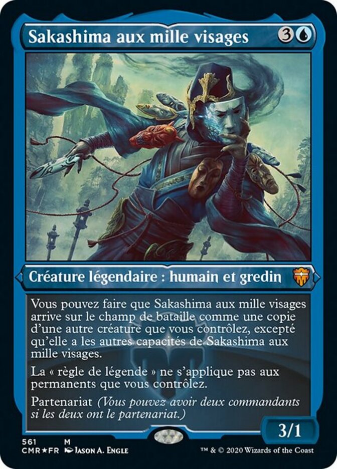 | Rules | You may have Sakashima of a Thousand Faces enter the battlefield as a copy of another creature you control, except it has Sakashima of a Thousand Faces's other abilities. The "legend rule" doesn't apply to permanents you control. Partner (You can have two commanders if both have partner.) |