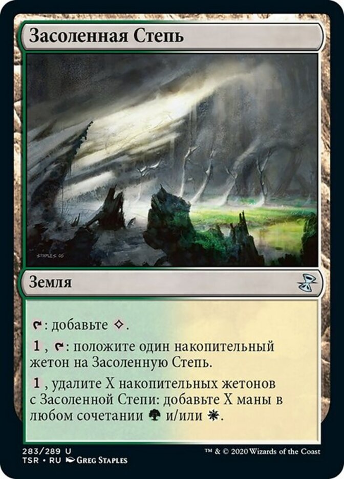 | Rules | : Add . , : Put a storage counter on Saltcrusted Steppe. , Remove X storage counters from Saltcrusted Steppe: Add X mana in any combination of and/or . |