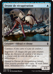 | Rules | Devoid (This card has no color.) Ingest (Whenever this creature deals combat damage to a player, that player exiles the top card of their library.) When Salvage Drone dies, you may draw a card. If you do, discard a card. |