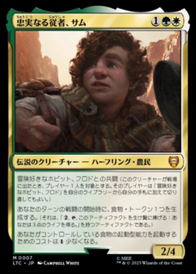 | Rules | Partner with Frodo, Adventurous Hobbit (When this creature enters the battlefield, target player may put Frodo into their hand from their library, then shuffle.) At the beginning of combat on your turn, create a Food token. (It's an artifact with ", , Sacrifice this artifact: You gain 3 life.") Activated abilities of Foods you control cost less to activate. |