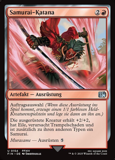 | Rules | Job select (When this Equipment enters, create a 1/1 colorless Hero creature token, then attach this to it.) Equipped creature gets +2/+2, has trample and haste, and is a Samurai in addition to its other types. Murasame — Equip |