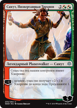 | Rules | Creatures you control have haste. −1: Target creature gets +2/+1 and gains haste until end of turn. Scry 1. |