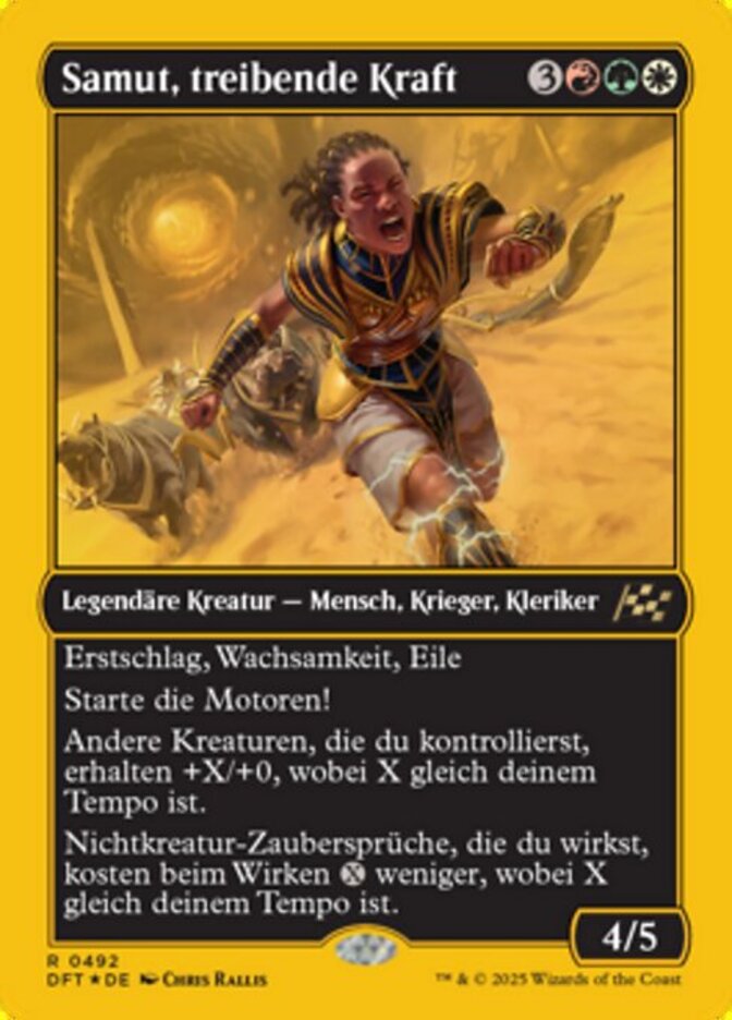 | Rules | First strike, vigilance, haste Start your engines! (If you have no speed, it starts at 1. It increases once on each of your turns when an opponent loses life. Max speed is 4.) Other creatures you control get +X/+0, where X is your speed. Noncreature spells you cast cost less to cast, where X is your speed. |