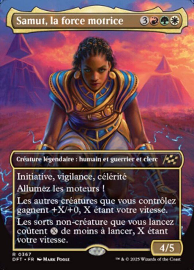 | Rules | First strike, vigilance, haste Start your engines! (If you have no speed, it starts at 1. It increases once on each of your turns when an opponent loses life. Max speed is 4.) Other creatures you control get +X/+0, where X is your speed. Noncreature spells you cast cost less to cast, where X is your speed. |