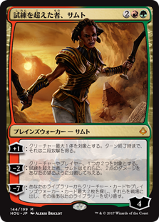| Rules | +1: Up to one target creature gains double strike until end of turn. −2: Samut, the Tested deals 2 damage divided as you choose among one or two targets. −7: Search your library for up to two creature and/or planeswalker cards, put them onto the battlefield, then shuffle. |