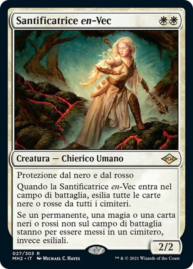 | Rules | Protection from black and from red When Sanctifier en-Vec enters the battlefield, exile all cards that are black or red from all graveyards. If a black or red permanent, spell, or card not on the battlefield would be put into a graveyard, exile it instead. |