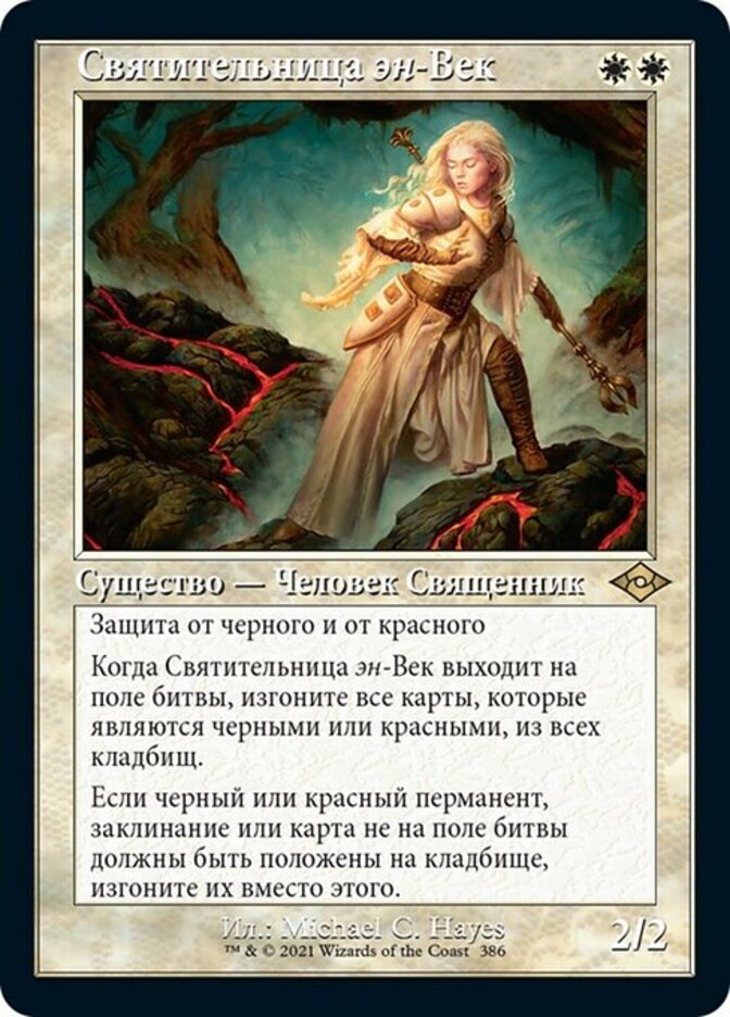 | Rules | Protection from black and from red When Sanctifier en-Vec enters the battlefield, exile all cards that are black or red from all graveyards. If a black or red permanent, spell, or card not on the battlefield would be put into a graveyard, exile it instead. |