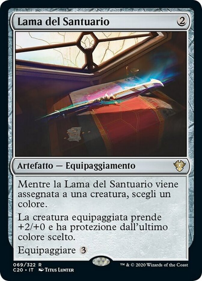 | Rules | As Sanctuary Blade becomes attached to a creature, choose a color. Equipped creature gets +2/+0 and has protection from the last chosen color. Equip |