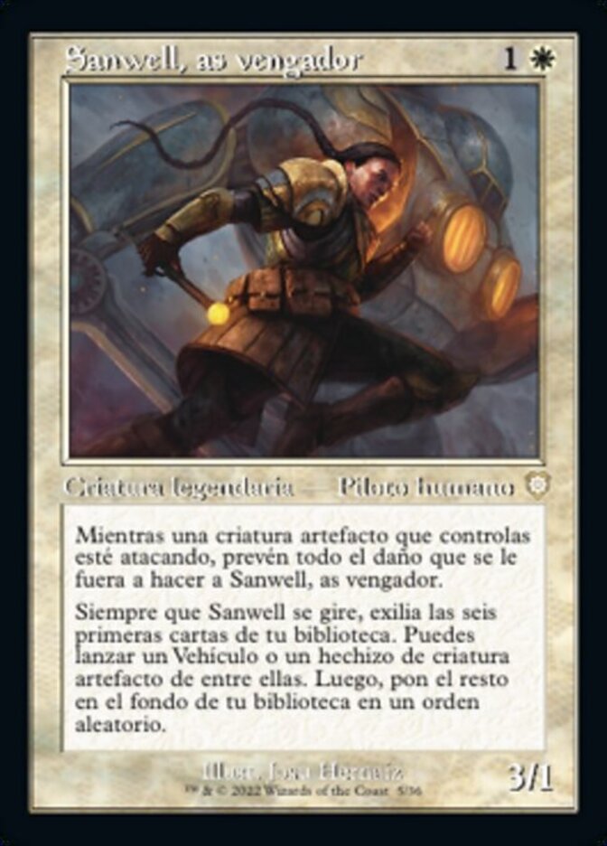 | Rules | As long as an artifact creature you control is attacking, prevent all damage that would be dealt to Sanwell, Avenger Ace. Whenever Sanwell becomes tapped, exile the top six cards of your library. You may cast a Vehicle or artifact creature spell from among them. Then put the rest on the bottom of your library in a random order. |