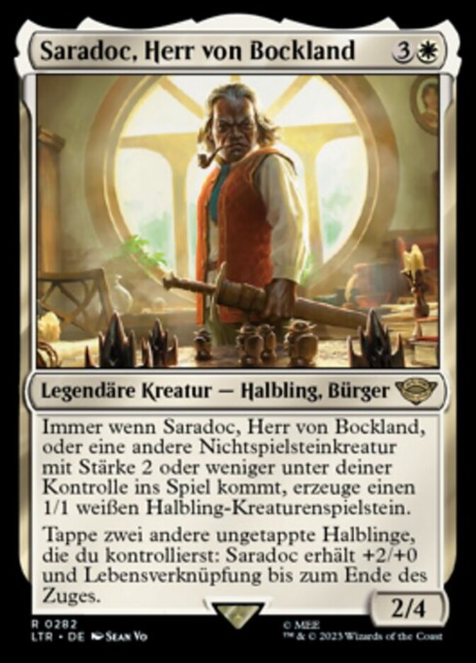 | Rules | Whenever Saradoc, Master of Buckland or another nontoken creature with power 2 or less enters the battlefield under your control, create a 1/1 white Halfling creature token. Tap two other untapped Halflings you control: Saradoc gets +2/+0 and gains lifelink until end of turn. |