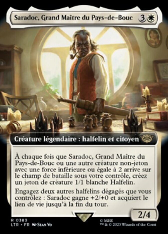 | Rules | Whenever Saradoc, Master of Buckland or another nontoken creature with power 2 or less enters the battlefield under your control, create a 1/1 white Halfling creature token. Tap two other untapped Halflings you control: Saradoc gets +2/+0 and gains lifelink until end of turn. |