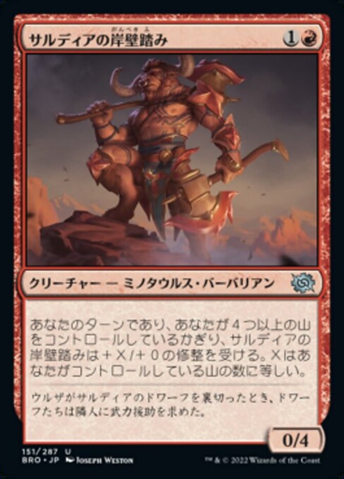 | Rules | As long as it's your turn and you control four or more Mountains, Sardian Cliffstomper gets +X/+0, where X is the number of Mountains you control. |