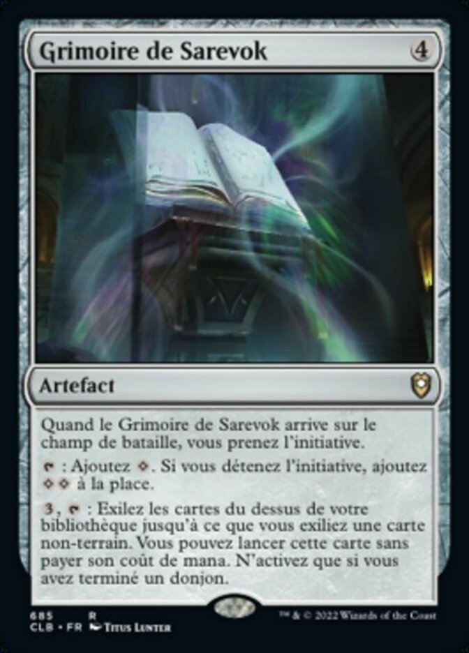 | Rules | When Sarevok's Tome enters the battlefield, you take the initiative. : Add . If you have the initiative, add instead. , : Exile cards from the top of your library until you exile a nonland card. You may cast that card without paying its mana cost. Activate only if you've completed a dungeon. |