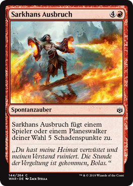 | Rules | Sarkhan's Catharsis deals 5 damage to target player or planeswalker. |