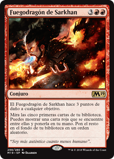 | Rules | Sarkhan's Dragonfire deals 3 damage to any target. Look at the top five cards of your library. You may reveal a red card from among them and put it into your hand. Put the rest on the bottom of your library in a random order. |