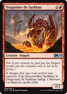 | Rules | Flying (This creature can't be blocked except by creatures with flying or reach.) Whenever you activate an ability of a Sarkhan planeswalker, Sarkhan's Whelp deals 1 damage to any target. |