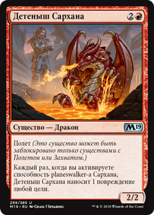 | Rules | Flying (This creature can't be blocked except by creatures with flying or reach.) Whenever you activate an ability of a Sarkhan planeswalker, Sarkhan's Whelp deals 1 damage to any target. |