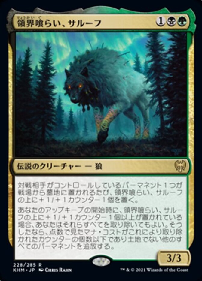 | Rules | Whenever a permanent an opponent controls is put into a graveyard from the battlefield, put a +1/+1 counter on Sarulf, Realm Eater. At the beginning of your upkeep, if Sarulf has one or more +1/+1 counters on it, you may remove all of them. If you do, exile each other nonland permanent with mana value less than or equal to the number of counters removed this way. |