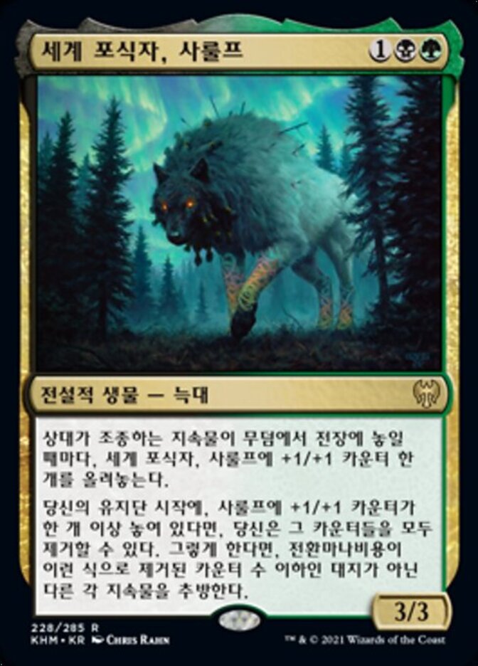 | Rules | Whenever a permanent an opponent controls is put into a graveyard from the battlefield, put a +1/+1 counter on Sarulf, Realm Eater. At the beginning of your upkeep, if Sarulf has one or more +1/+1 counters on it, you may remove all of them. If you do, exile each other nonland permanent with mana value less than or equal to the number of counters removed this way. |