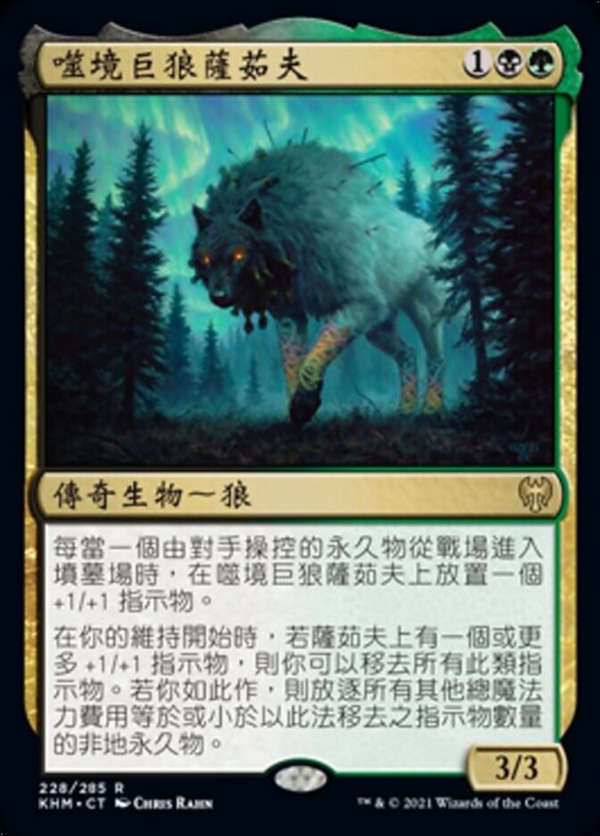 | Rules | Whenever a permanent an opponent controls is put into a graveyard from the battlefield, put a +1/+1 counter on Sarulf, Realm Eater. At the beginning of your upkeep, if Sarulf has one or more +1/+1 counters on it, you may remove all of them. If you do, exile each other nonland permanent with mana value less than or equal to the number of counters removed this way. |