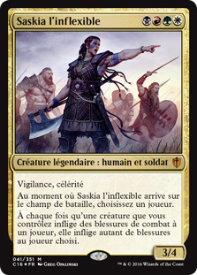| Rules | Vigilance, haste As Saskia the Unyielding enters the battlefield, choose a player. Whenever a creature you control deals combat damage to a player, it deals that much damage to the chosen player. |