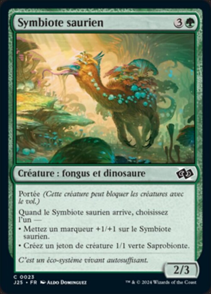 | Rules | Reach (This creature can block creatures with flying.) When Saurian Symbiote enters, choose one — • Put a +1/+1 counter on Saurian Symbiote. • Create a 1/1 green Saproling creature token. |