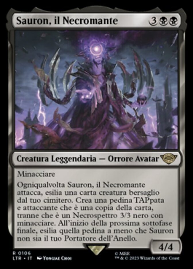 | Rules | Menace Whenever Sauron, the Necromancer attacks, exile target creature card from your graveyard. Create a tapped and attacking token that's a copy of that card, except it's a 3/3 black Wraith with menace. At the beginning of the next end step, exile that token unless Sauron is your Ring-bearer. |