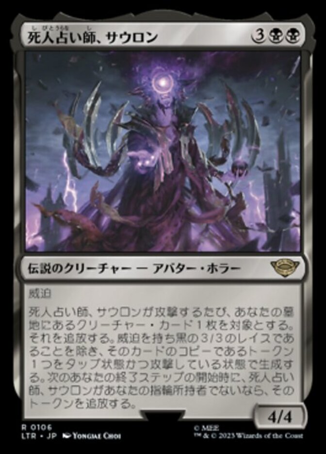 | Rules | Menace Whenever Sauron, the Necromancer attacks, exile target creature card from your graveyard. Create a tapped and attacking token that's a copy of that card, except it's a 3/3 black Wraith with menace. At the beginning of the next end step, exile that token unless Sauron is your Ring-bearer. |