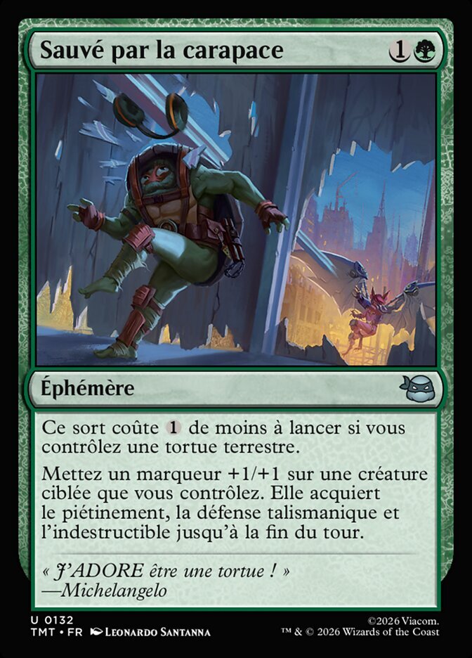 | Rules | This spell costs less to cast if you control a Turtle. Put a +1/+1 counter on target creature you control. It gains trample, hexproof, and indestructible until end of turn. |