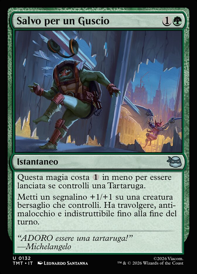 | Rules | This spell costs less to cast if you control a Turtle. Put a +1/+1 counter on target creature you control. It gains trample, hexproof, and indestructible until end of turn. |