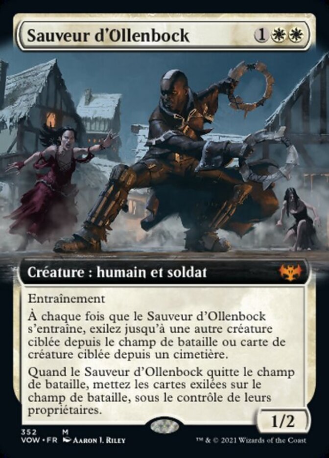 | Rules | Training (Whenever this creature attacks with another creature with greater power, put a +1/+1 counter on this creature.) Whenever Savior of Ollenbock trains, exile up to one other target creature from the battlefield or creature card from a graveyard. When Savior of Ollenbock leaves the battlefield, put the exiled cards onto the battlefield under their owners' control. |