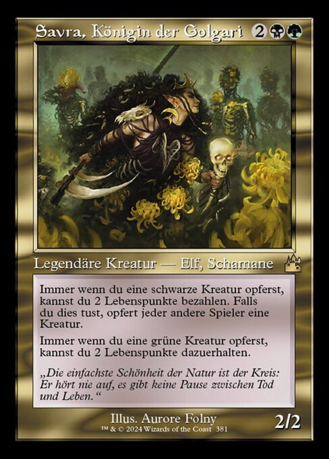 | Rules | Whenever you sacrifice a black creature, you may pay 2 life. If you do, each other player sacrifices a creature. Whenever you sacrifice a green creature, you may gain 2 life. |