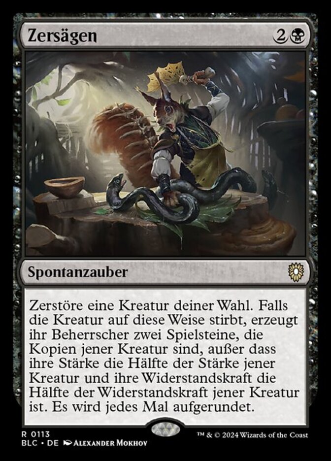 | Rules | Destroy target creature. If that creature dies this way, its controller creates two tokens that are copies of that creature, except their base power is half that creature's power and their base toughness is half that creature's toughness. Round up each time. |