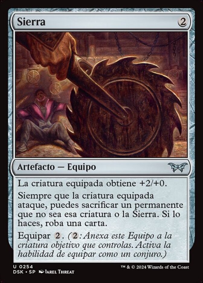 | Rules | Equipped creature gets +2/+0. Whenever equipped creature attacks, you may sacrifice a permanent other than that creature or Saw. If you do, draw a card. Equip (: Attach to target creature you control. Equip only as a sorcery.) |