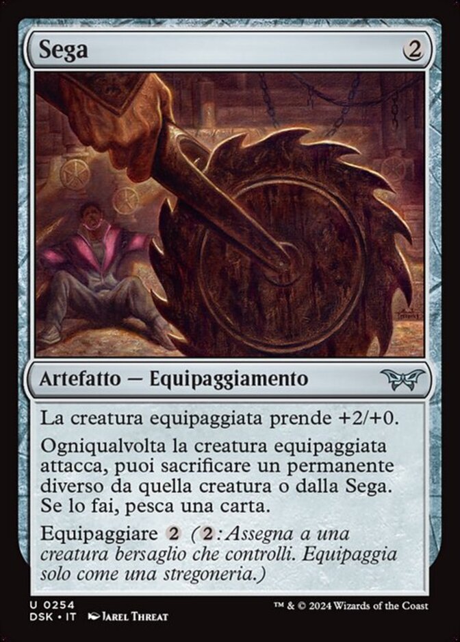 | Rules | Equipped creature gets +2/+0. Whenever equipped creature attacks, you may sacrifice a permanent other than that creature or Saw. If you do, draw a card. Equip (: Attach to target creature you control. Equip only as a sorcery.) |