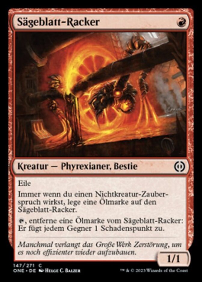 | Rules | Haste Whenever you cast a noncreature spell, put an oil counter on Sawblade Scamp. , Remove an oil counter from Sawblade Scamp: It deals 1 damage to each opponent. |
