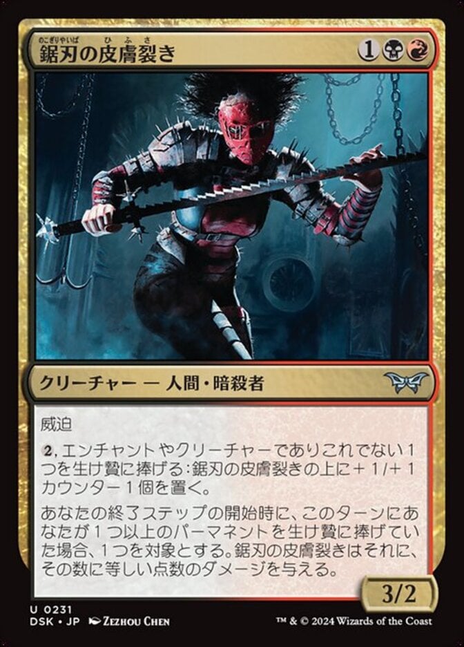 | Rules | Menace , Sacrifice another creature or enchantment: Put a +1/+1 counter on Sawblade Skinripper. At the beginning of your end step, if you sacrificed one or more permanents this turn, Sawblade Skinripper deals that much damage to any target. |
