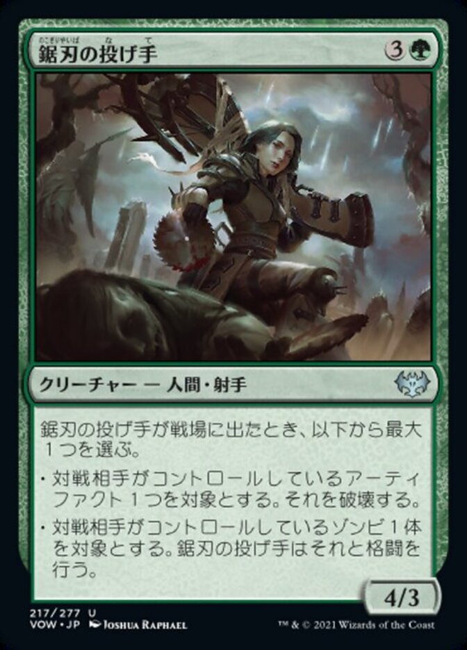 | Rules | When Sawblade Slinger enters the battlefield, choose up to one — • Destroy target artifact an opponent controls. • Sawblade Slinger fights target Zombie an opponent controls. |