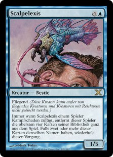 | Rules | Flying (This creature can't be blocked except by creatures with flying or reach.) Whenever Scalpelexis deals combat damage to a player, that player exiles the top four cards of their library. If two or more of those cards have the same name, repeat this process. |