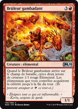 | Rules | When Scampering Scorcher enters the battlefield, create two 1/1 red Elemental creature tokens. Elementals you control gain haste until end of turn. (They can attack and this turn.) |