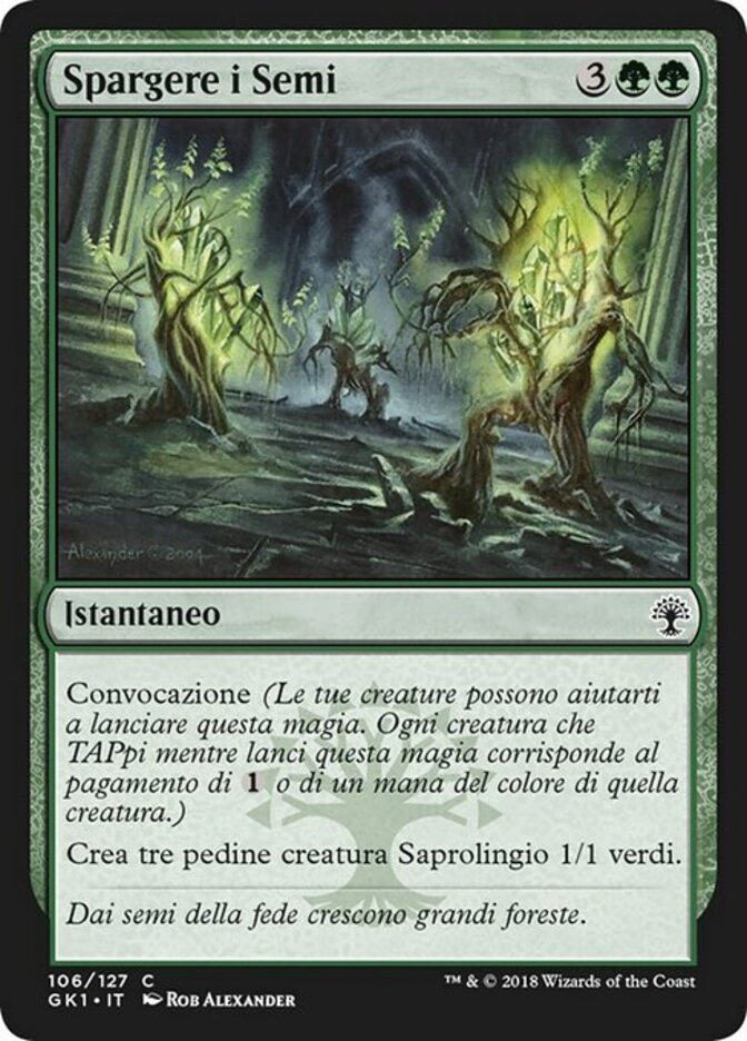 | Rules | Convoke (Your creatures can help cast this spell. Each creature you tap while casting this spell pays for or one mana of that creature's color.) Create three 1/1 green Saproling creature tokens. |