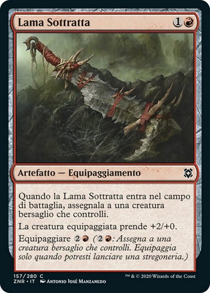 | Rules | When Scavenged Blade enters the battlefield, attach it to target creature you control. Equipped creature gets +2/+0. Equip (: Attach to target creature you control. Equip only as a sorcery.) |