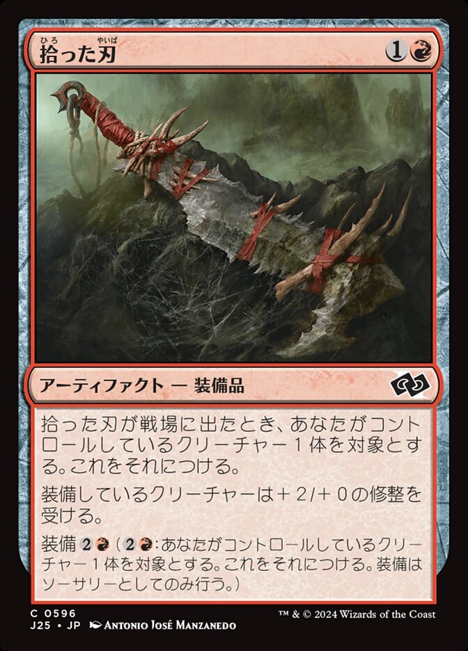 | Rules | When Scavenged Blade enters the battlefield, attach it to target creature you control. Equipped creature gets +2/+0. Equip (: Attach to target creature you control. Equip only as a sorcery.) |